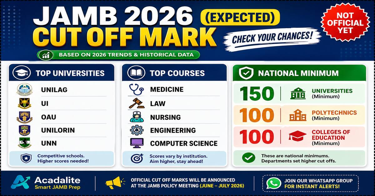 The official JAMB cut off mark for 2026 is not out yet. See the expected scores for Medicine, Law, Nursing, Engineering and top universities like UNILAG, UI, and OAU.